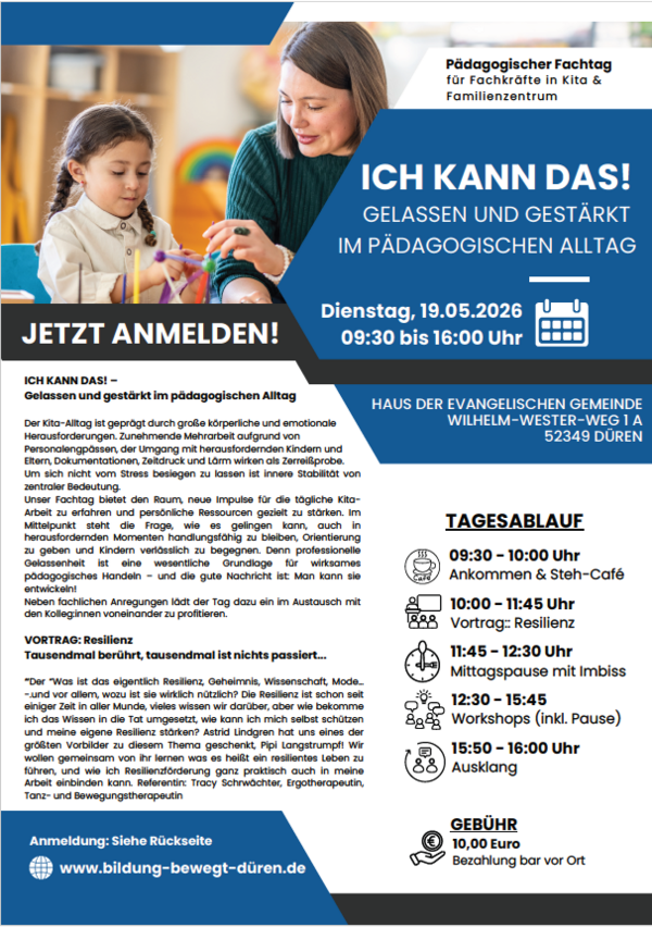 Unser Fachtag bietet den Raum, neue Impulse für die tägliche Kita-Arbeit zu erfahren und persönliche Ressourcen gezielt zu stärken. Im Mittelpunkt steht die Frage, wie es gelingen kann, auch in herausfordernden Momenten handlungsfähig zu bleiben, Orientierung zu geben und Kindern verlässlich zu begegnen. Denn professionelle Gelassenheit ist eine wesentliche Grundlage für wirksames pädagogisches Handeln – und die gute Nachricht ist: Man kann sie entwickeln!